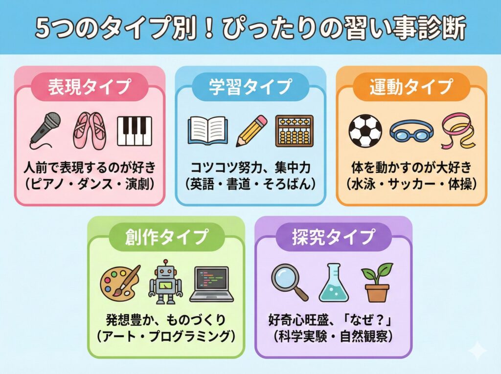 お子さんにぴったりの習い事を見つけるには、まず子どもの個性や特性を理解することが大切です。ここでは、5つのタイプに分けて、それぞれに適した小学生習い事おすすめをご紹介します。