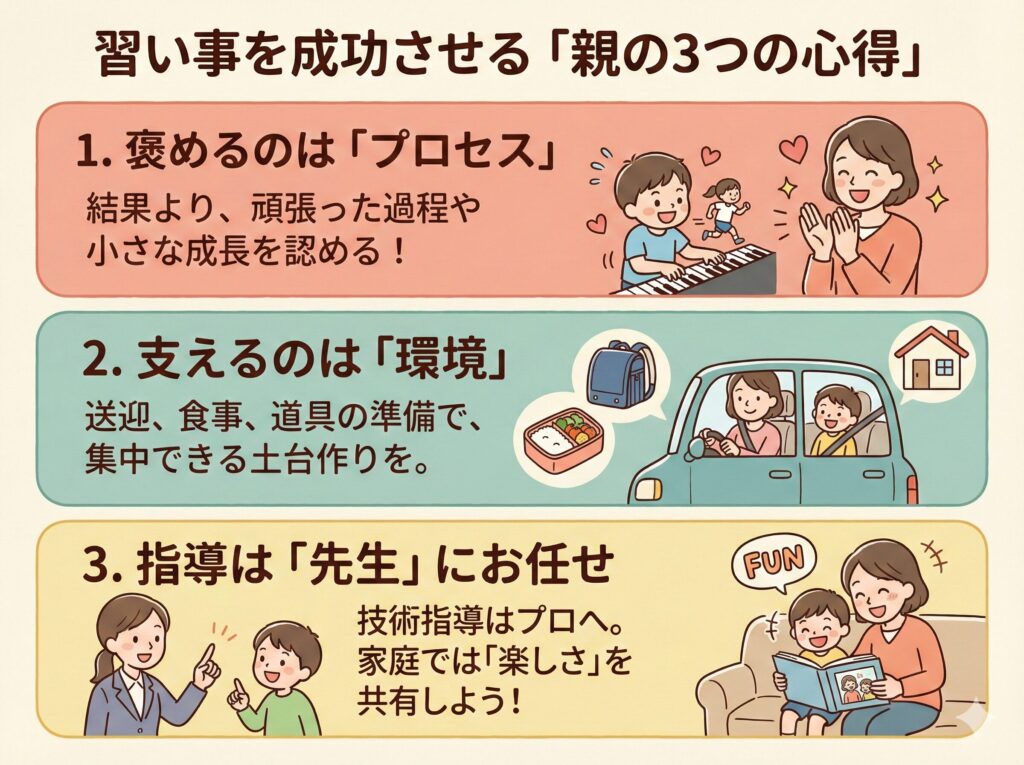 送迎や道具の準備など、環境を整えることに集中し、技術的な指導は先生に任せるという姿勢が大切です。家庭では、子どもの話を聞いたり、一緒に練習を楽しんだりする程度に留めましょう。