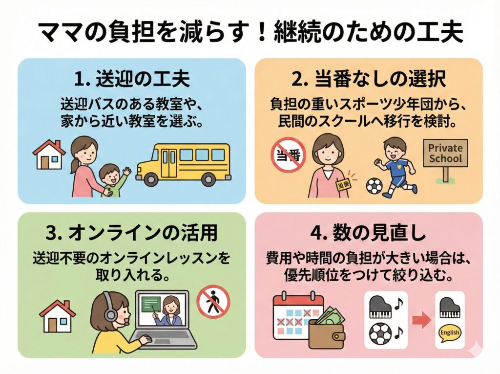 費用面での負担が重い場合は、習い事の数を見直したり、より安価な選択肢を探したりすることも必要です。オンラインレッスンや地域の公的な教室なども活用できます。